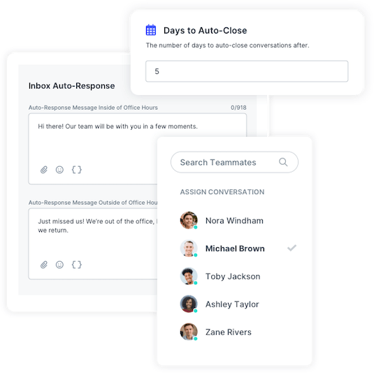 Assign conversations based on your team’s needs, close conversations after a set number of days, and configure auto-responses outside of office hours.