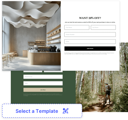 Examples of web forms created with templates inside of the SlickText texting platform Example of a website popup to collect SMS subscribers Example of a tap-to-join link posted on an Instagram story and SMS confirmation message Restaurant customer scanning a QR code to join an text message marketing list Cafe visitor signing up for promotional texts by sending a keyword